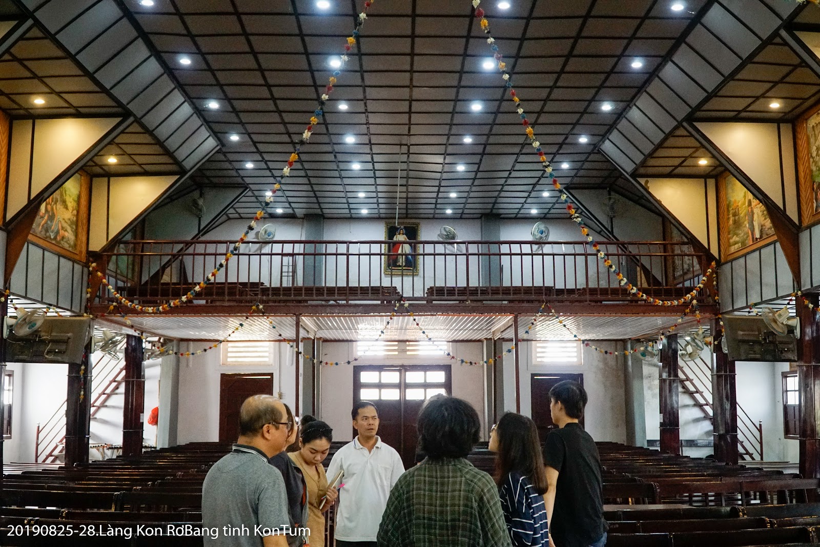 Một nhóm đo đạc và ghi nhận lại hiện trang của nhà thờ giáo xứ Kon RơBang để chuẩn bị phương án di dời vào giữa phần đất của giáo xứ,